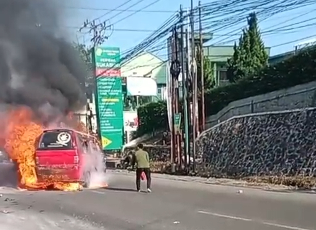 SUKABUMI – Sebuah angkutan kota (angkot) jurusan Goalpara hangus terbakar di depan Rumah Sakit Hermina Kota Sukabumi pada Kamis (07/08/25) siang. Beruntung, saat kejadian kendaraan dalam keadaan kosong tanpa penumpang.