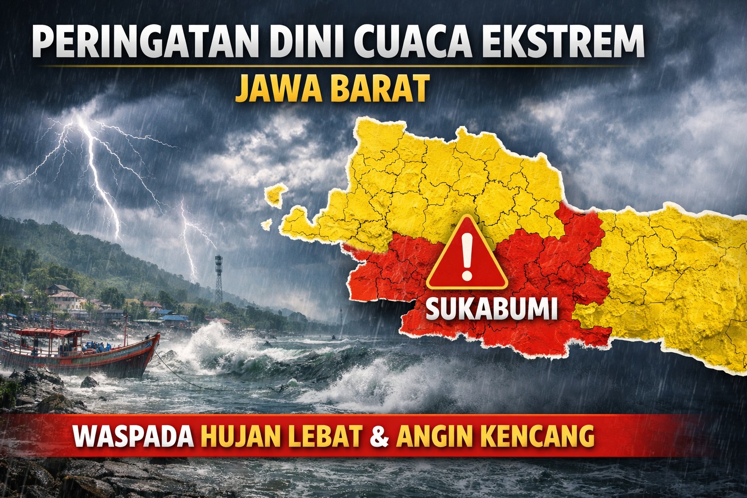 SUKABUMI – Badan Meteorologi, Klimatologi, dan Geofisika (BMKG) Jawa Barat mengeluarkan peringatan dini cuaca pada Sabtu (11/1/2026). Sejumlah wilayah di Jawa Barat diprakirakan berpotensi mengalami hujan sedang hingga lebat yang dapat disertai kilat/petir serta angin kencang.