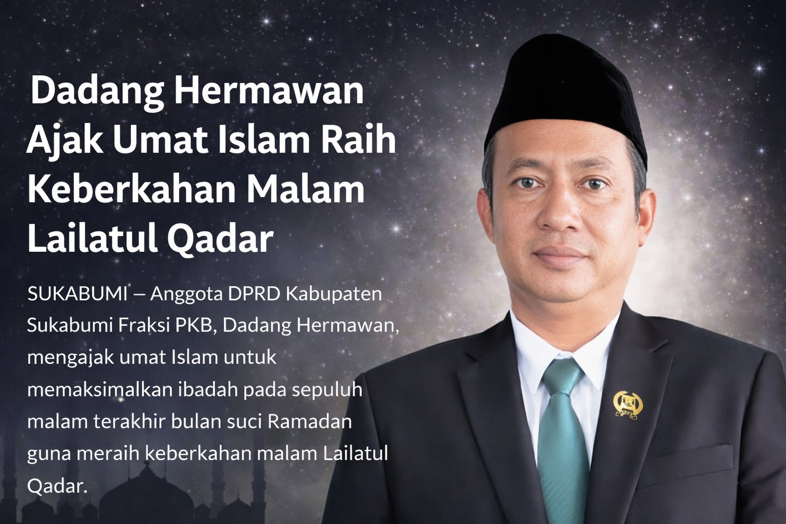 SUKABUMI – Anggota DPRD Kabupaten Sukabumi dari Fraksi PKB, Dadang Hermawan, mengajak umat Islam untuk memaksimalkan ibadah pada sepuluh malam terakhir bulan suci Ramadan guna meraih keberkahan malam Lailatul Qadar.