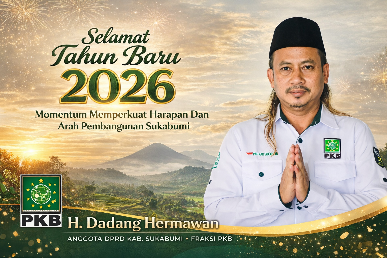 SUKABUMI – Anggota DPRD Kabupaten Sukabumi dari Fraksi Partai Kebangkitan Bangsa (PKB), Dadang Hermawan, menyampaikan ucapan Selamat Tahun Baru 2026 kepada seluruh masyarakat Kabupaten Sukabumi. Ia mengajak momentum pergantian tahun ini dijadikan sebagai titik tolak untuk memperkuat harapan, semangat kebersamaan, dan komitmen bersama dalam membangun daerah.