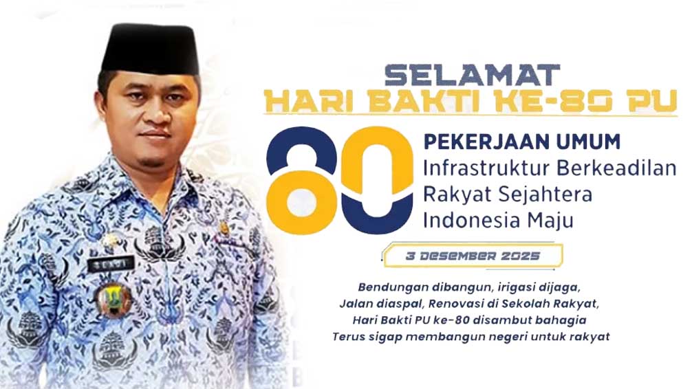 SUKABUMI – Kepala Dinas Perumahan dan Kawasan Permukiman (Disperkim) Kabupaten Sukabumi, Sendi Apriadi, menyampaikan ucapan selamat memperingati Hari Bakti Pekerjaan Umum (PU) yang ke-80. Dalam pesannya, ia mendorong semangat untuk terus berkarya menghadirkan permukiman yang layak, berkeadilan, dan humanis bagi seluruh masyarakat.