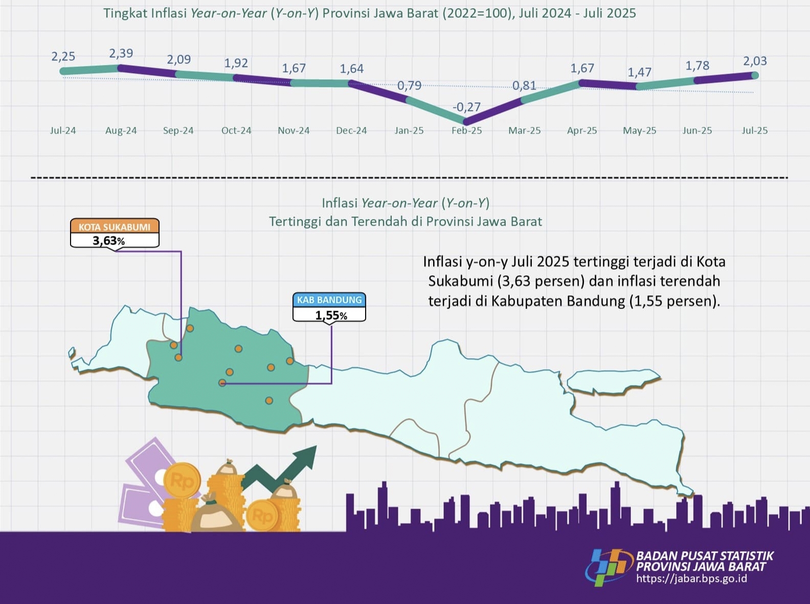 Berdasarkan data BPS, Kota Sukabumi menjadi daerah dengan inflasi tertinggi se-Jawa Barat, sedangkan inflasi terendah tercatat di Kabupaten Bandung sebesar 1,55 persen.