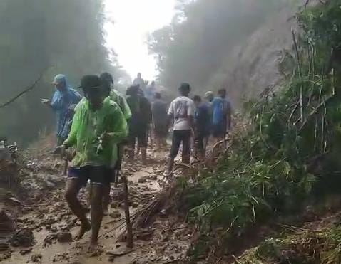 Menyadari jalan tersebut adalah satu-satunya akses menuju pusat pemerintahan, warga setempat segera bergotong royong membersihkan material secara manual.