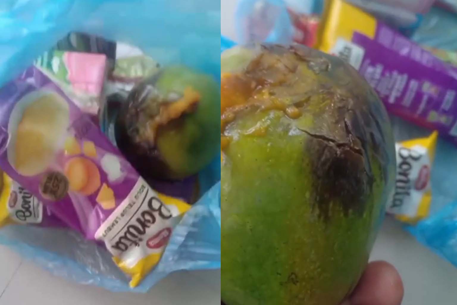 “Manggah buruk rek naon didedeut-dedeutnya (mangga busuk buat apa dimasukin),” kata pria itu mempertanyakan alasan buah yang sudah tidak layak konsumsi itu masih dimasukkan ke dalam paket.