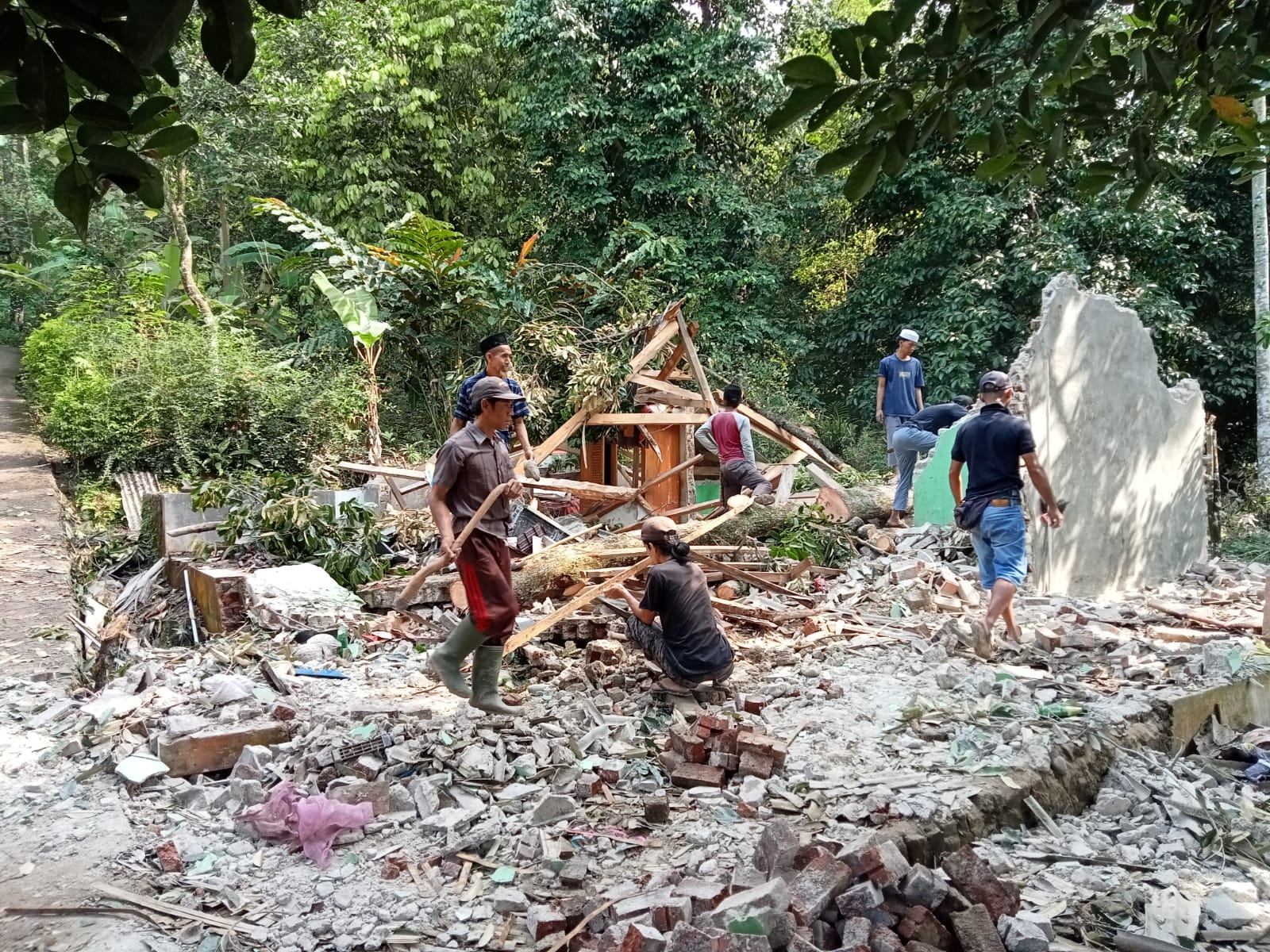 “Ibu dan anaknya sedang berada di dalam rumah ketika pohon tumbang. Untungnya mereka masih bisa keluar lewat celah sempit sebelum rumah benar-benar roboh. Kini keduanya sudah dievakuasi dan mengungsi ke rumah warga,” tutur Ibadulloh.