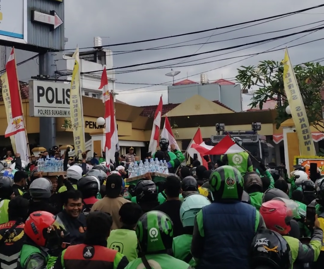 Sejak pukul 13.00 WIB, massa mulai memadati halaman depan Polres Sukabumi Kota. Mereka datang berkonvoi menggunakan sepeda motor lengkap dengan atribut komunitas ojek online masing-masing.