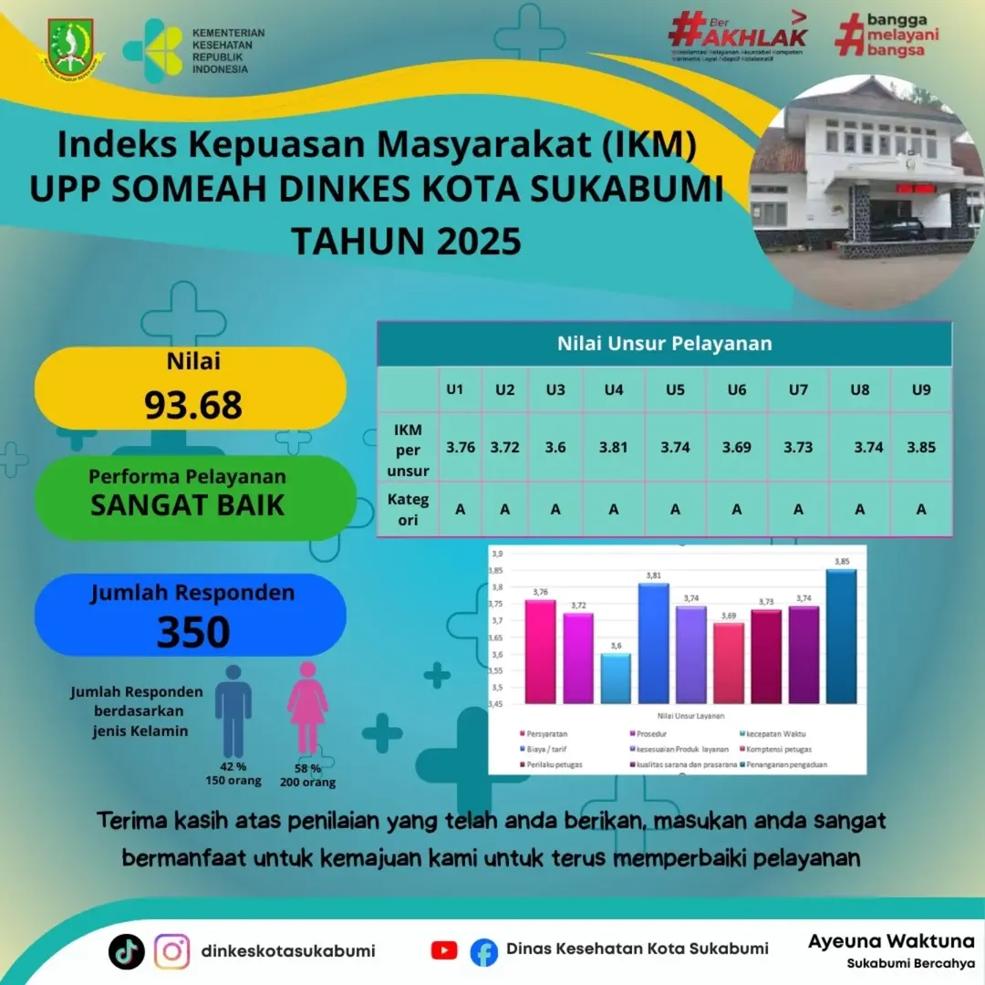 SUKABUMI – Unit pelayanan publik SOMEAH Dinas Kesehatan Kota Sukabumi mencatatkan hasil positif dalam Survei Kepuasan Masyarakat (SKM) tahun 2025. Dari hasil survei yang melibatkan 350 responden, Indeks Kepuasan Masyarakat (IKM) yang diperoleh mencapai angka 93,68 dengan kategori mutu pelayanan sangat baik.