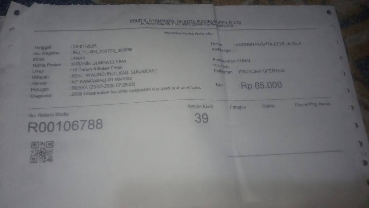 Nota pembayaran poliklinik di RSUD R. Syamsudin, S.H