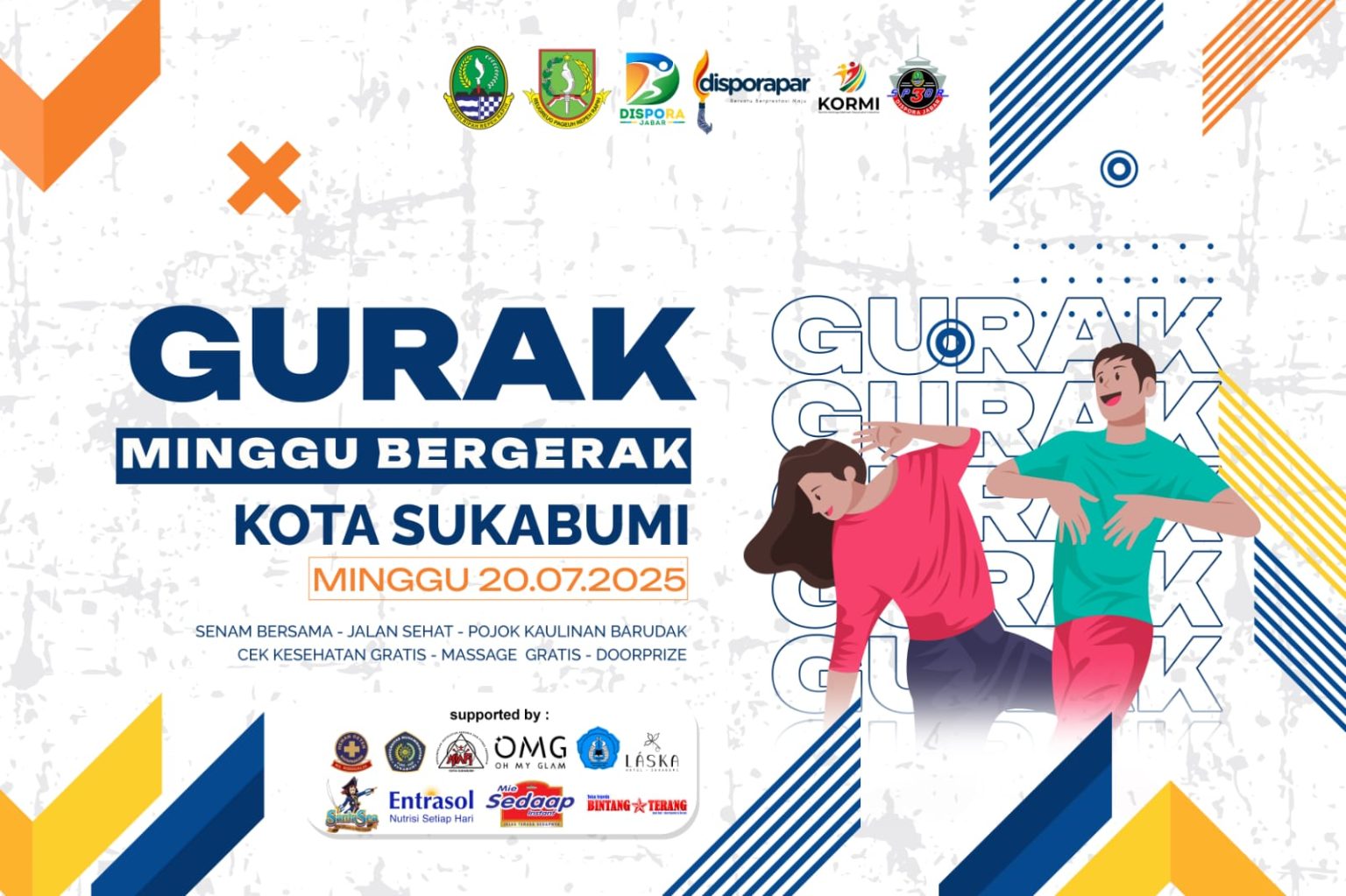 Sementara itu, pada Minggu (20/7/2025), dua kegiatan akan dilaksanakan serentak. Ajang Minggu Bergerak (Gurak) akan berlangsung di Lapangan Bhakti TNI AL Pasir Pogor, Kecamatan Gunung Puyuh, sedangkan peringatan Hari BMX Sedunia akan dipusatkan di Gedung Juang Kota Sukabumi.
