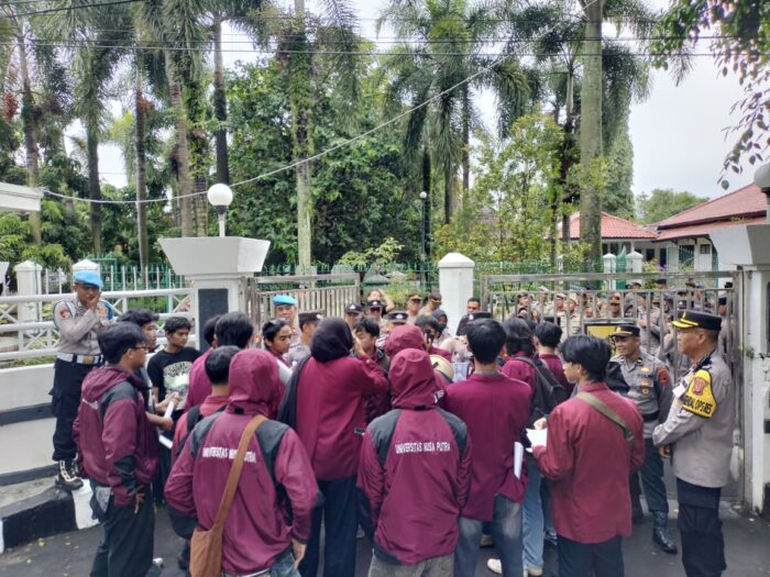 SUKABUMI Ratusan mahasiswa yang berasal dari berbagai kampus di Sukabumi mendatangi Pendopo Palabuhanratu, Kamis (6/11/2025). Aksi unjuk rasa yang berlangsung tertib ini menyuarakan penolakan terhadap operasional tambak udang yang beraktivitas di kawasan Pantai Mina Jaya, Kecamatan Surade.